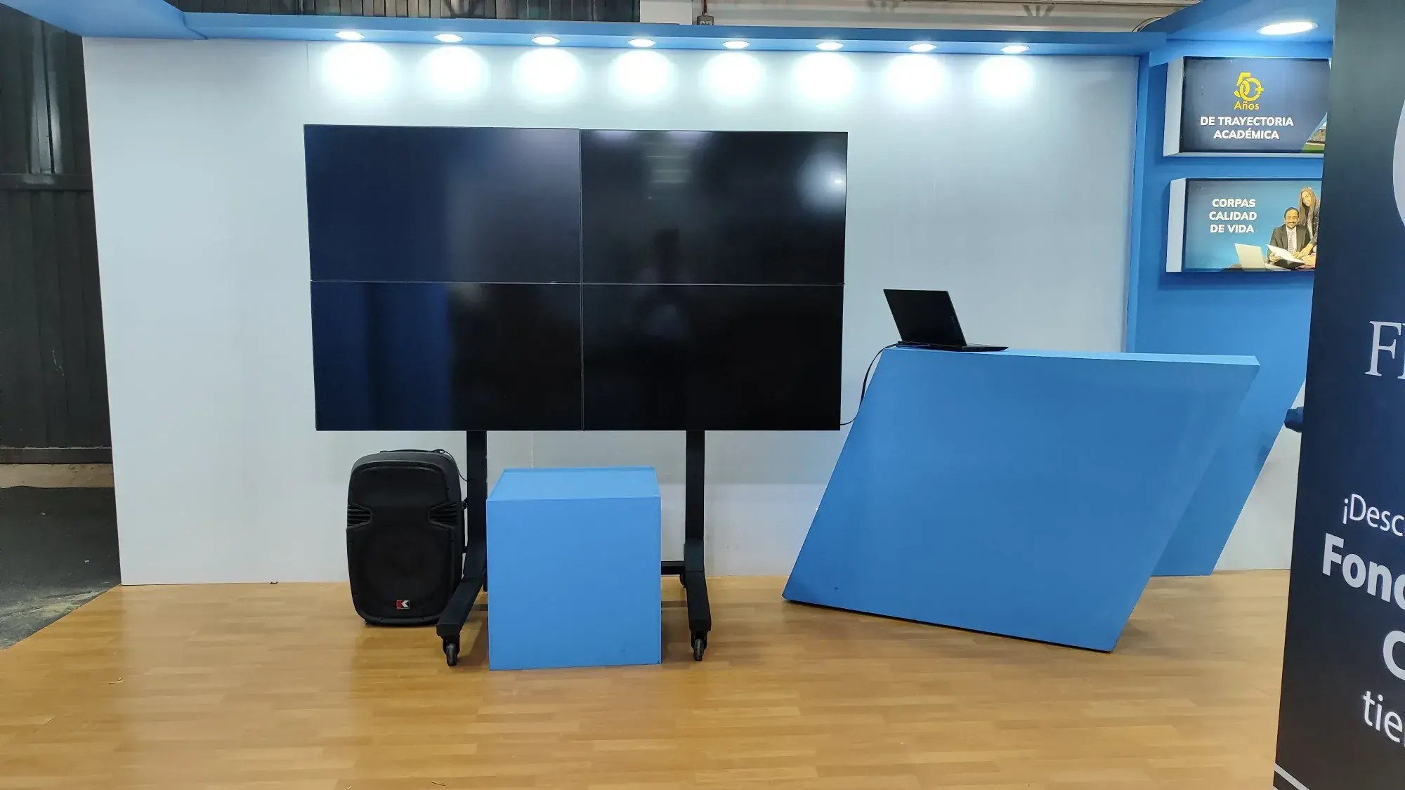 Conviértete en el punto de referencia del pabellón. El videowall 2x2 es la herramienta definitiva para atraer tráfico a tu stand y mostrar tus productos en gran formato.